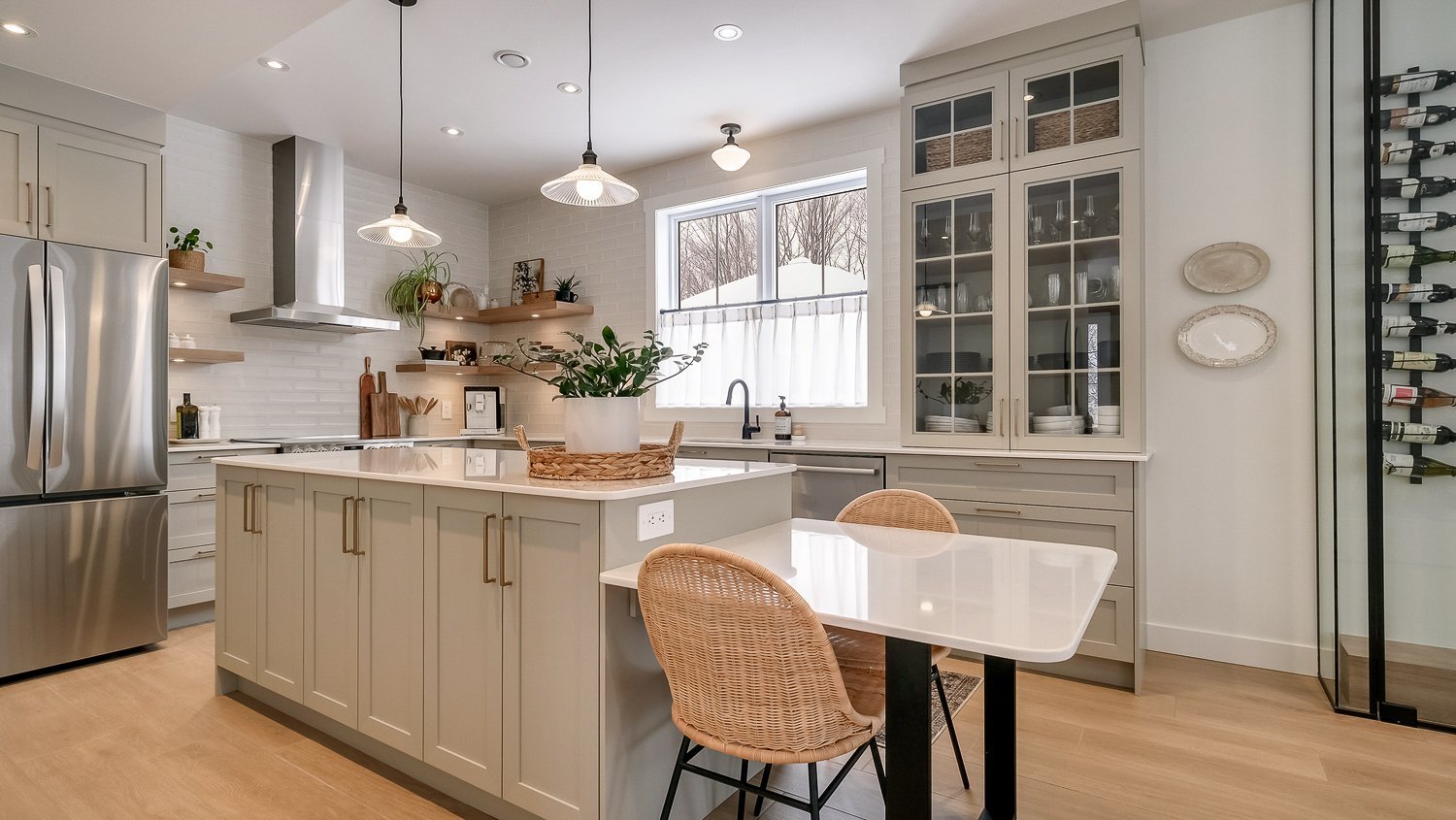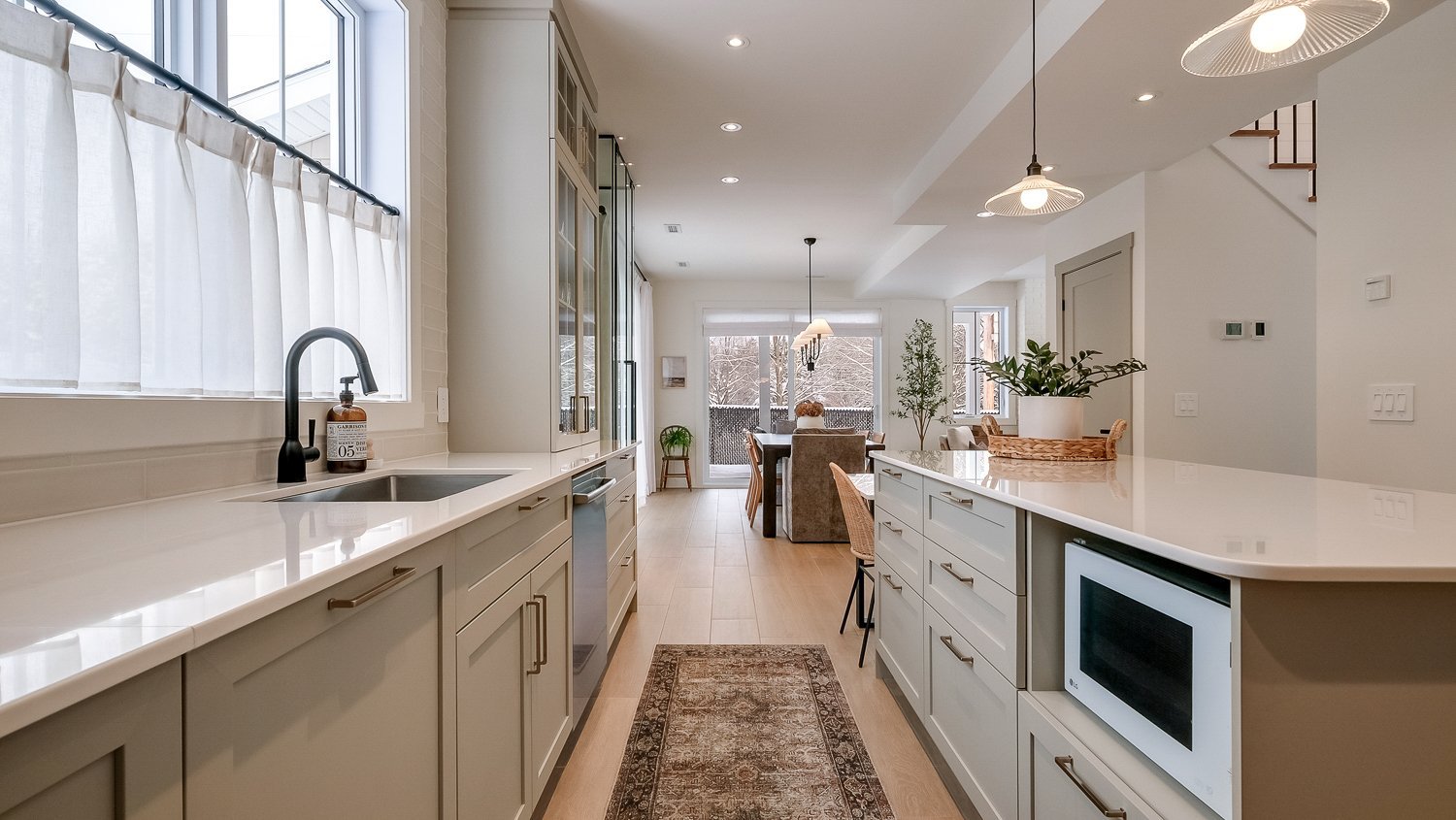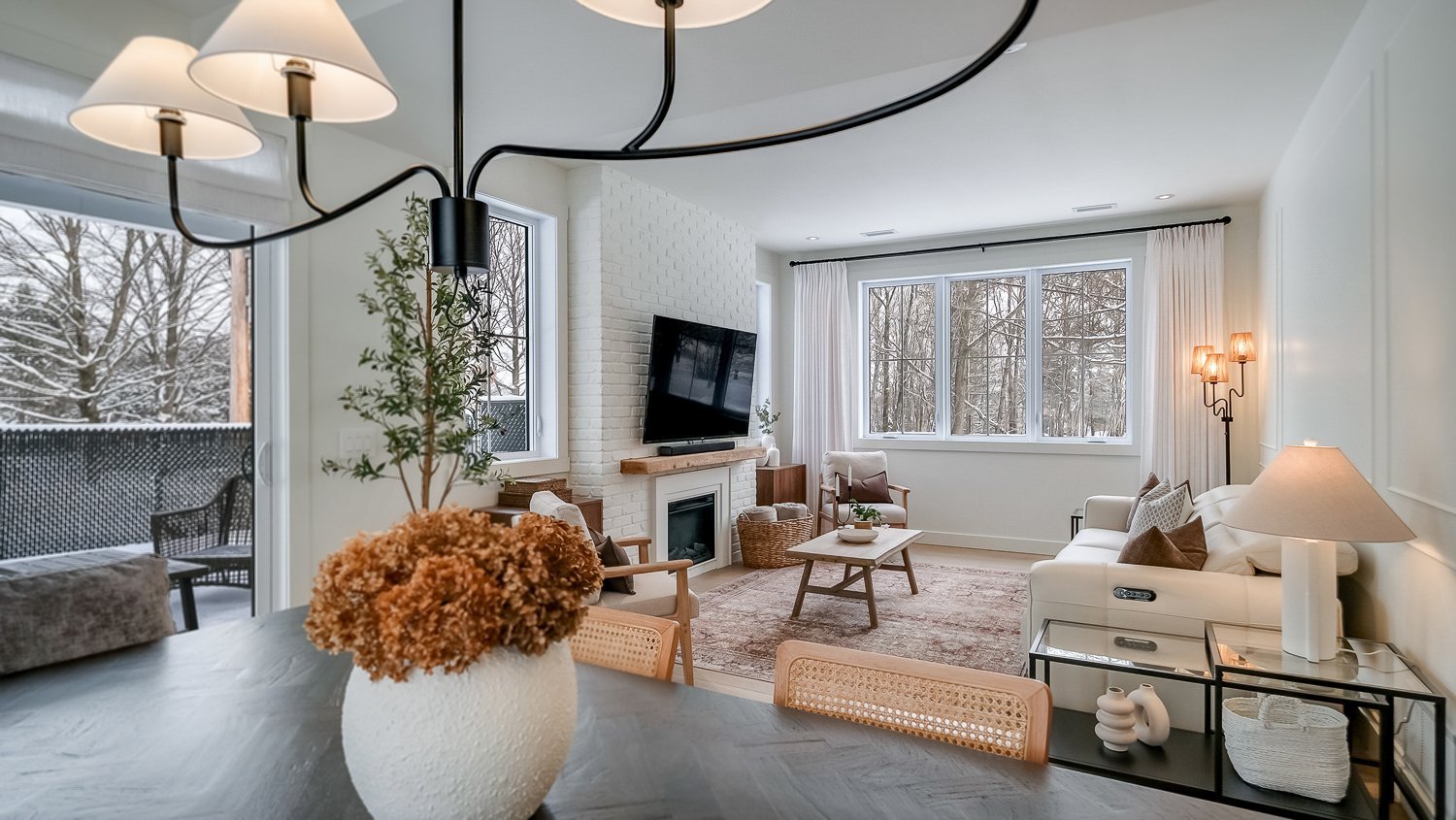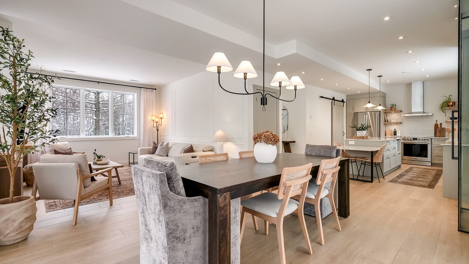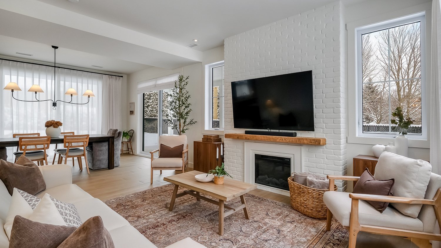 La maison est construite sur une dalle de béton isolée avec plancher chauffant électrique en 5 zones, témoignant d'une conception axée sur la durabilité, le confort et la qualité d'exécution. Le rez-de-chaussée, doté de plafonds de 9 pieds, propose un salon chaleureux au design épuré, une salle à manger conviviale idéale pour recevoir, ainsi qu'une cuisine fonctionnelle et raffinée, réalisée avec des matériaux de qualité supérieure, comprenant un îlot central et un garde-manger walk-in. L'aménagement a été soigneusement pensé pour répondre autant aux besoins du quotidien qu'aux réceptions.