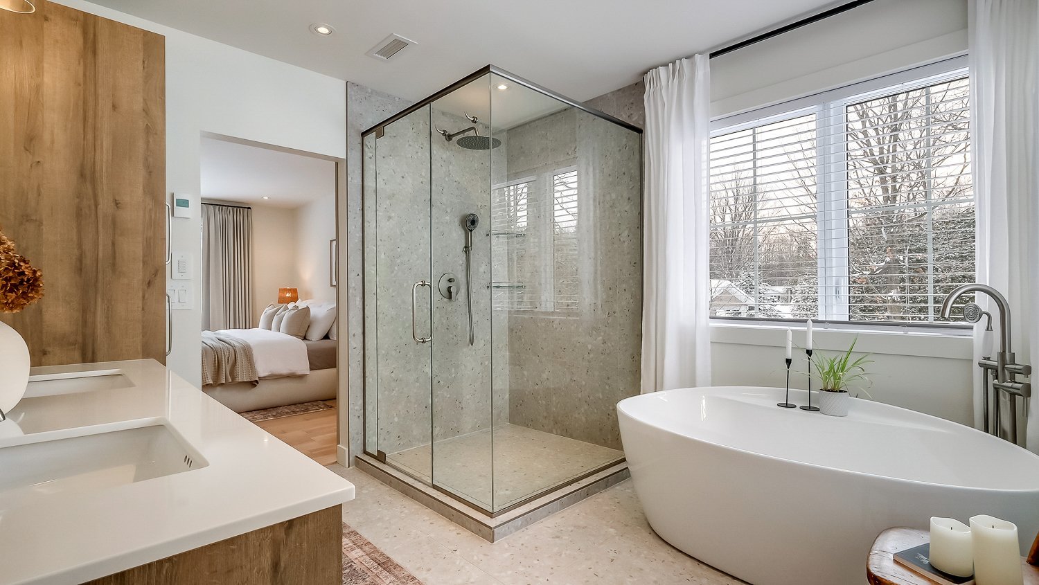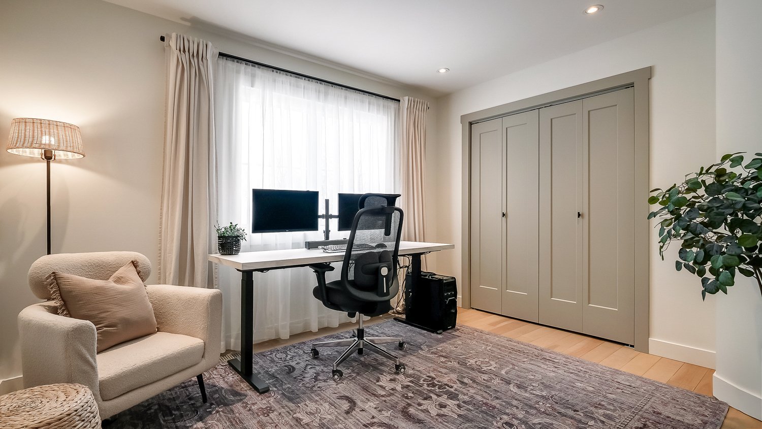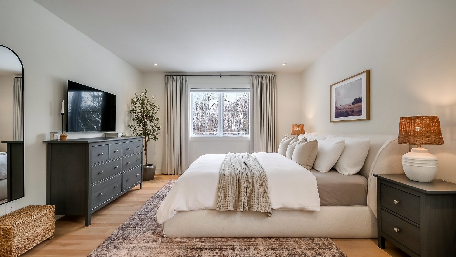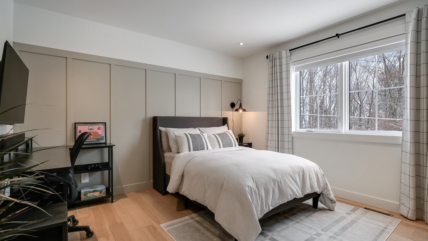 La propriété comprend quatre chambres à coucher, dont une chambre principale avec salle de bain attenante et grand garde-robe walk-in, offrant un espace intime et confortable. Les chambres sont lumineuses et polyvalentes, idéales pour une famille, un bureau à domicile ou une chambre d'invités. Les salles de bain se distinguent par leurs planchers chauffants, leurs matériaux modernes et leur finition haut de gamme, dans un style résolument contemporain.