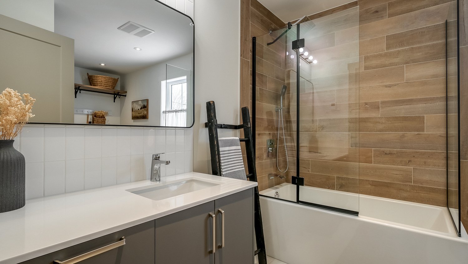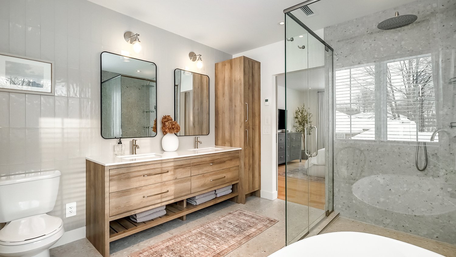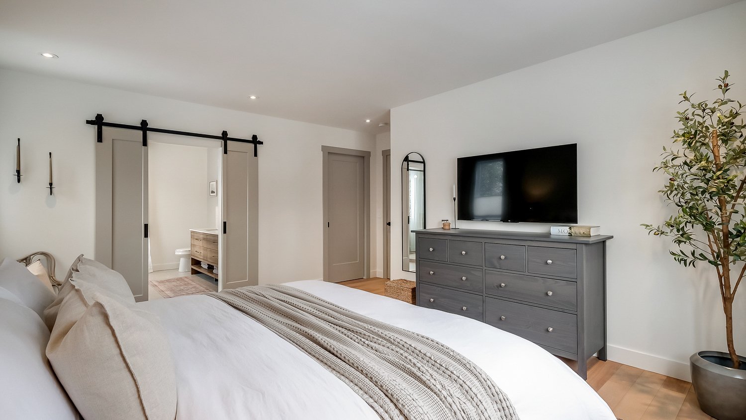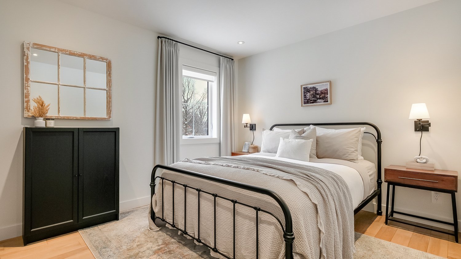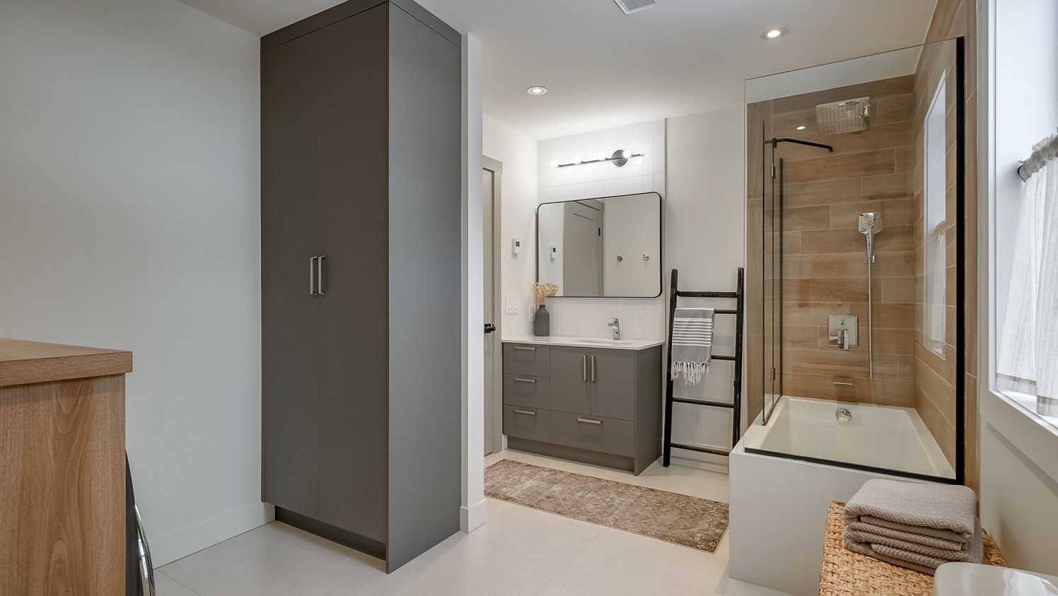 La propriété comprend quatre chambres à coucher, dont une chambre principale avec salle de bain attenante et grand garde-robe walk-in, offrant un espace intime et confortable. Les chambres sont lumineuses et polyvalentes, idéales pour une famille, un bureau à domicile ou une chambre d'invités. Les salles de bain se distinguent par leurs planchers chauffants, leurs matériaux modernes et leur finition haut de gamme, dans un style résolument contemporain.